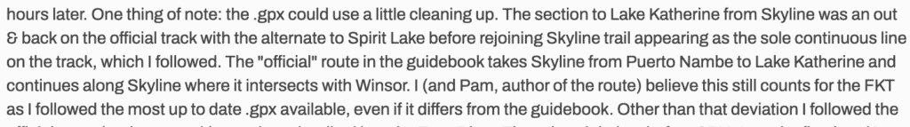 In Google maps the gpx file – downloaded directly from Bailey’s FKT page – does not show this issue. The gpx file correctly shows the route going past Lake Katherine (not past Spirit Lake, though that is an alt route for the thru-hike) with no out and back.