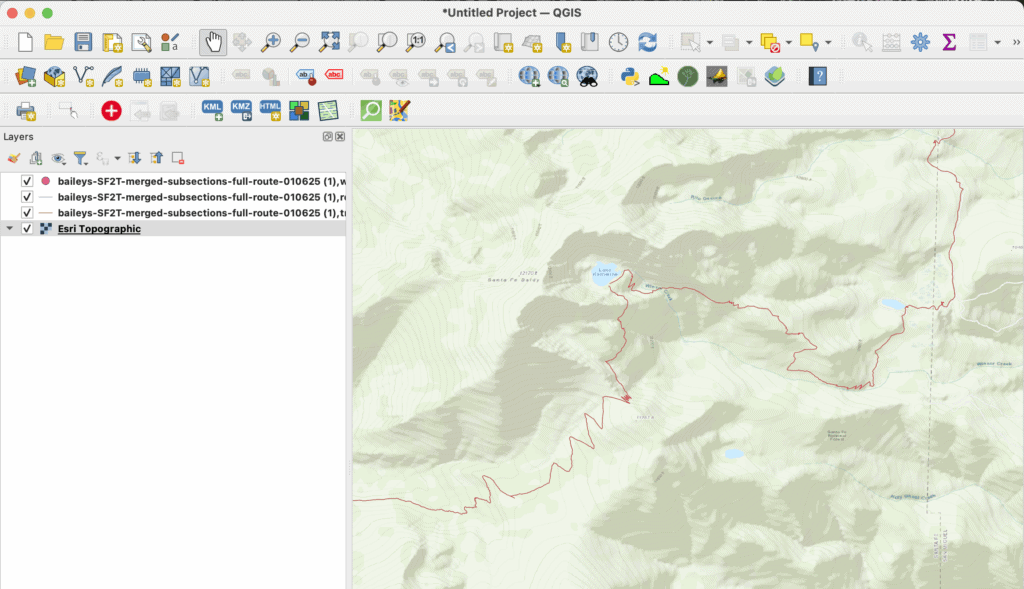 When imported into CalTopo, the gpx file (again, downloaded directly from Bailey’s FKT page) does not show this issue. The gpx file correctly shows the route going past Lake Katherine (not past Spirit Lake, though that is an alt route for the thru-hike) with no out and back.