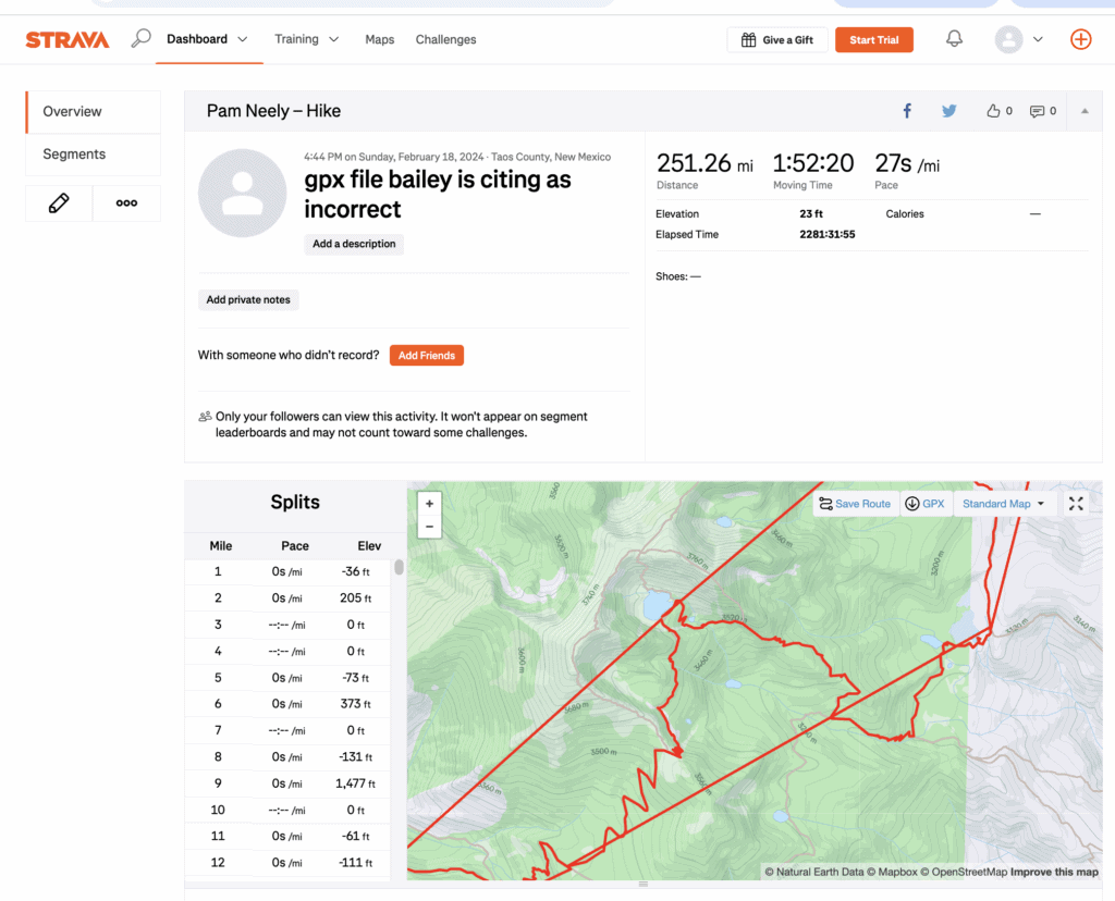 The people who recorded the first FKT record for the thru-hike, using the same gpx file, had no such problem with the gpx file.